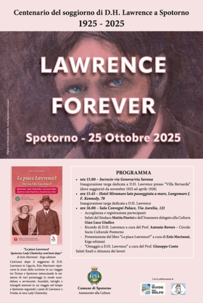 Seguirà, alle 16:00, nella Sala Convegni Palace di Spotorno, un convegno in cui interverranno, dopo i saluti istituzionali del Sindaco di Spotorno Mattia Fiorini e dell’Assessore alal Cultura Gian Luca Giudice, il Prof. Antonio Rovere del Circolo Socio Culturale Pontorno, il Prof. Giuseppe Conte, scrittore, traduttore e critico letterario, che ricorderanno la figura di Lawrence, e il giornalista e scrittore Ezio Marinoni parlerà anche del romanzo “Le piace Lawrence? Spotorno: Lady Chatterley cent’anni dopo” edito da Erga edizioni con il Patrocinio del Comune di Spotorno.